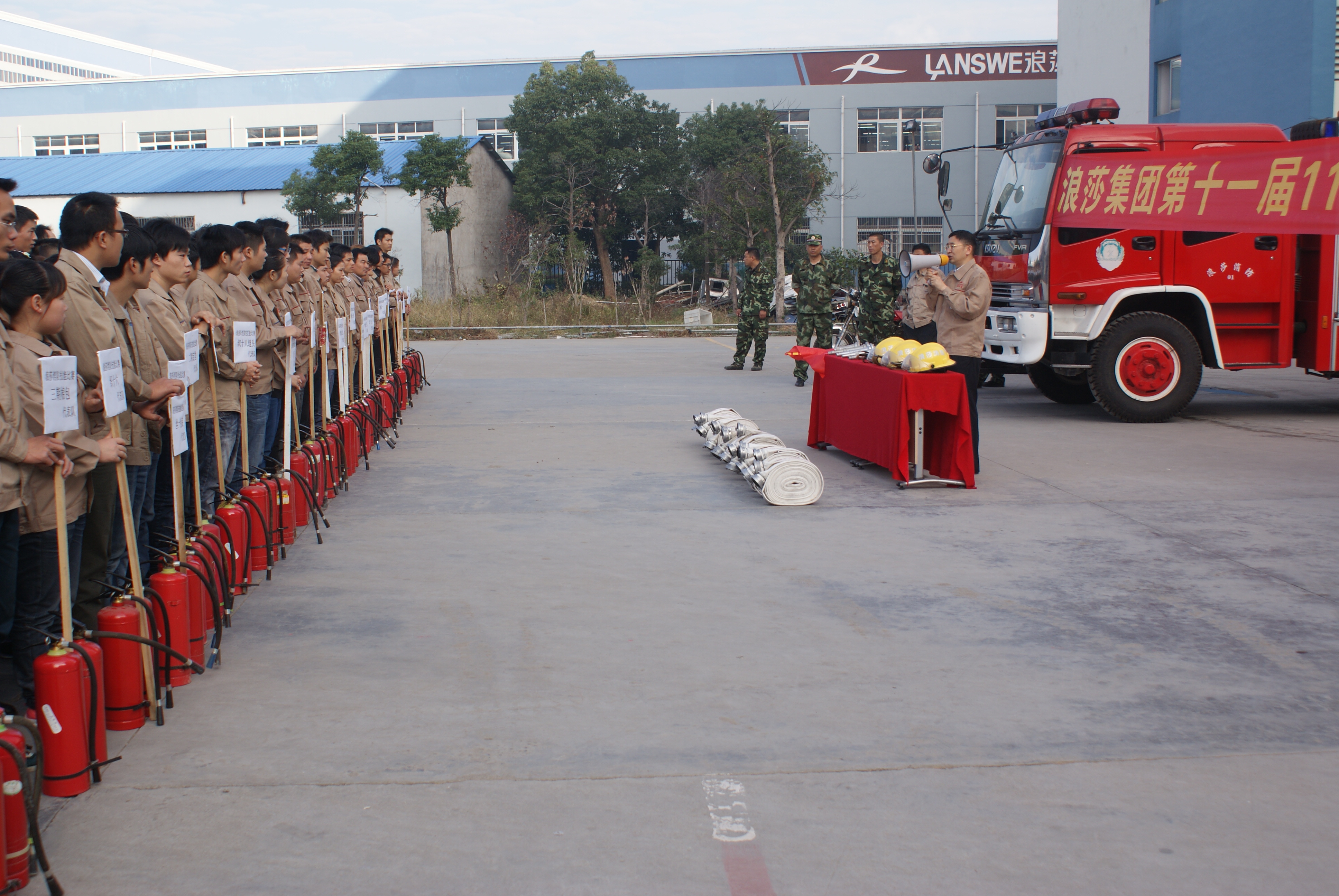浪莎集團第十一屆11.9消防大比武,浪莎集團第十一屆11.9消防大比武在浪莎三期工業園隆重舉辦,公司各部門車間都組成了消防隊參加比武,場面頗為壯觀。在董事長進行指示性講話之后,大比武正式開始了。只見參賽選手全副武裝,儼然是專業的消防隊員,他們在水袋、滅火器使用等環節中一一比拼,最終,絲襪定型2車間以綜合成績第一名摘得大比武的冠軍。